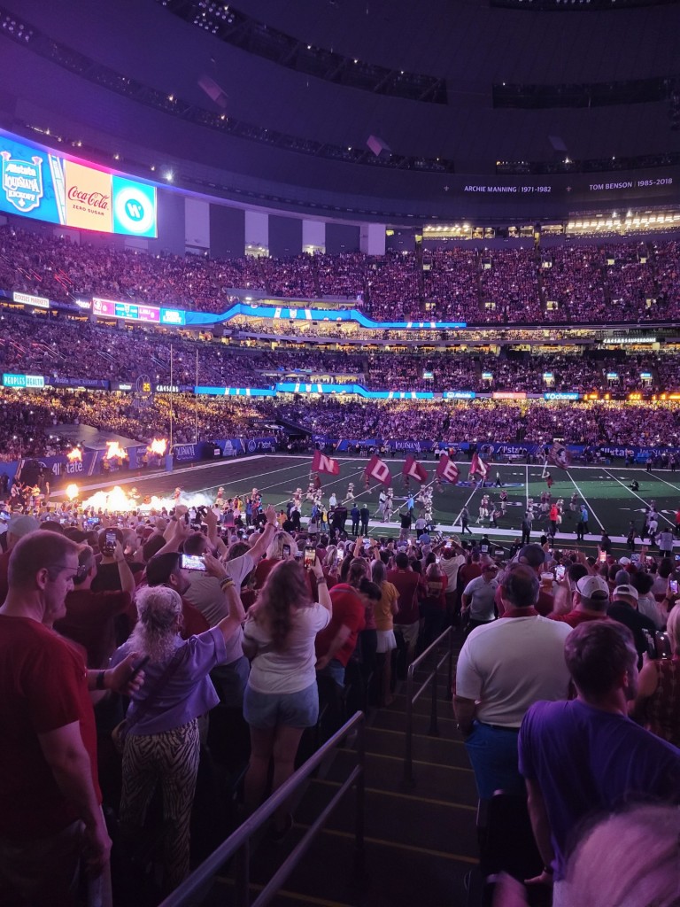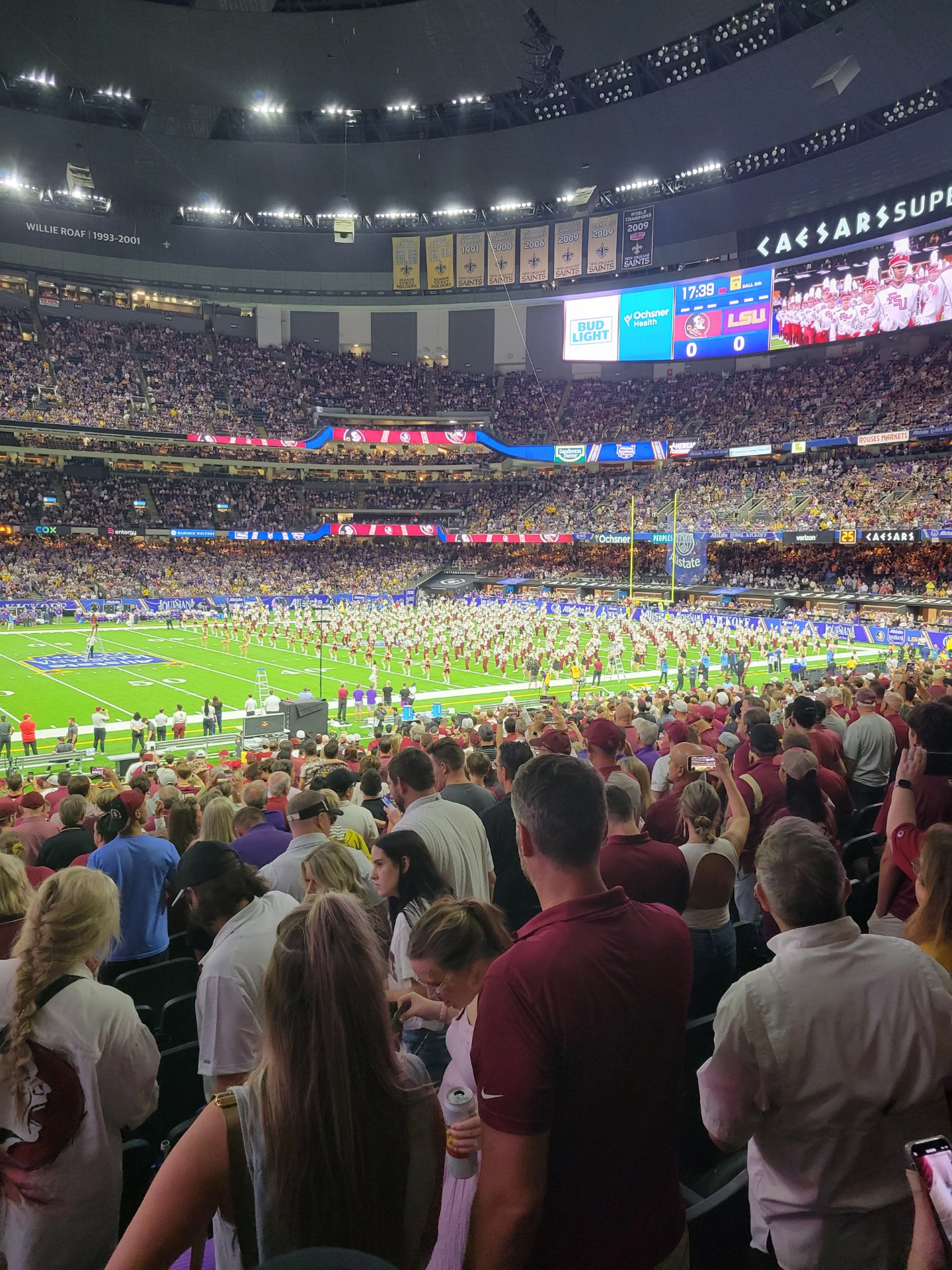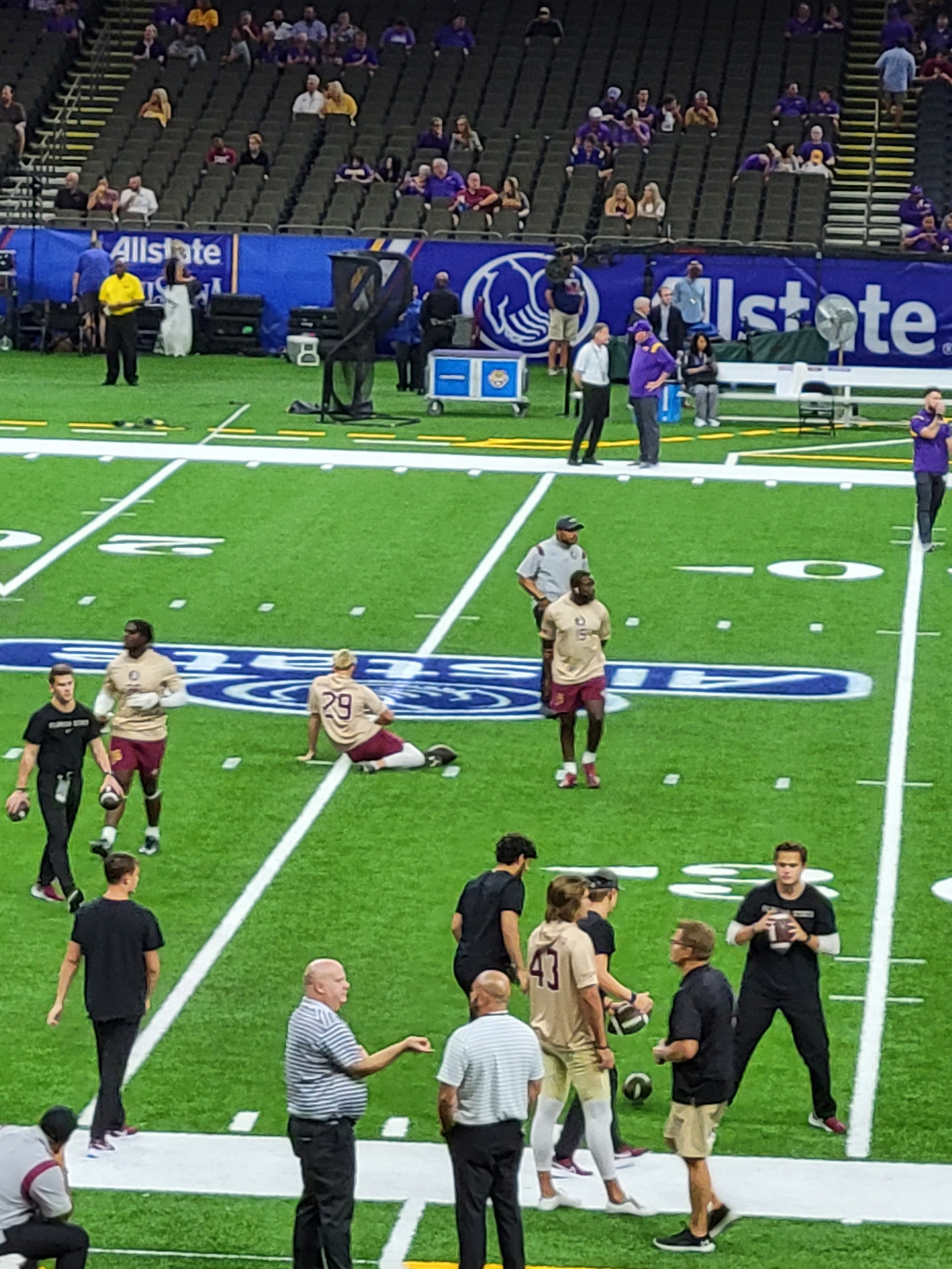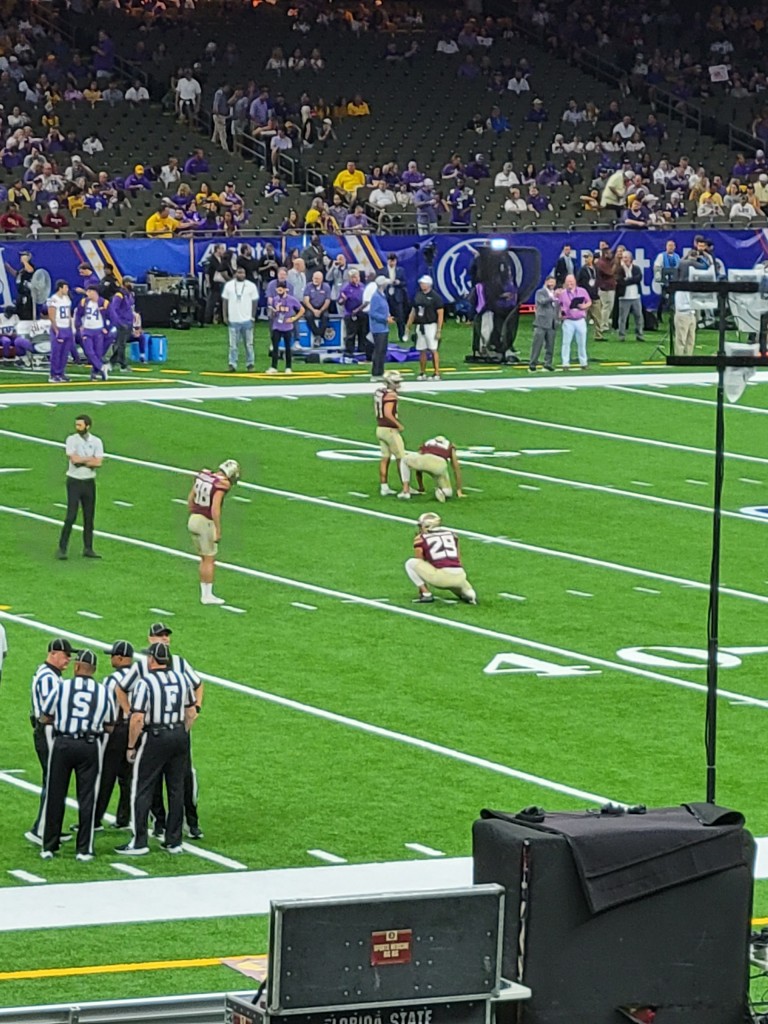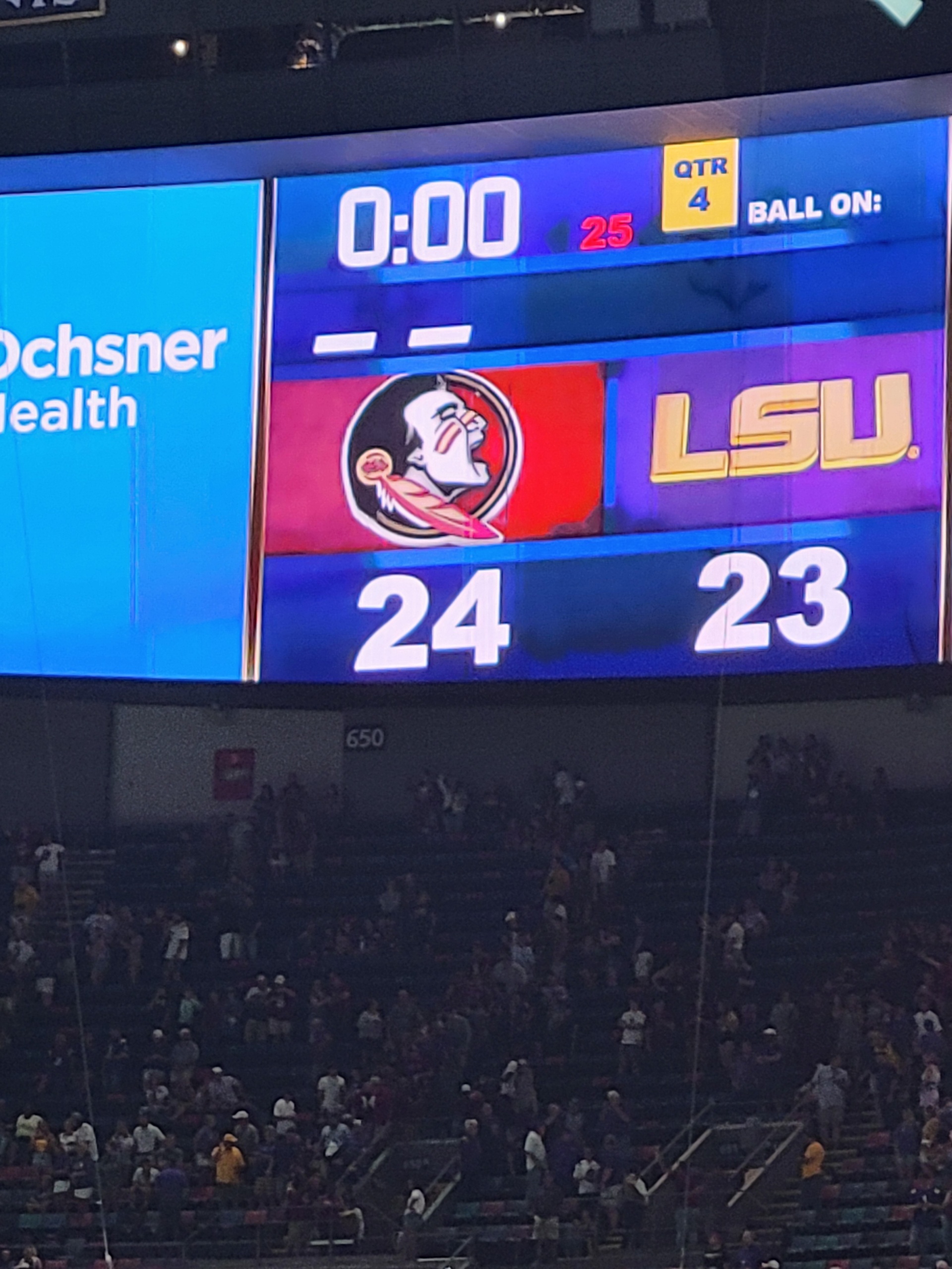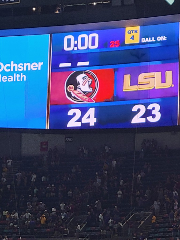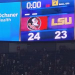 Truth be told, LSU should not have had a chance to tie the game though. Up by 7, FSU faced a 2nd and goal from the 1 yard line, but instead of handing the ball off, as they did early in the 3rd quarter to FB Lundy to score a TD, a short-tight-awkward quarterback pitch to the FSU RB resulted in a fumble. Of course, LSU marched down the field and, after a 5 minute official review determined that the Tigers would have a first and goal on the 1. The Tigers would score on the next play, but FSU’s Shyheim Brown blocked the attempt and sealed the deal for the ‘Noles.